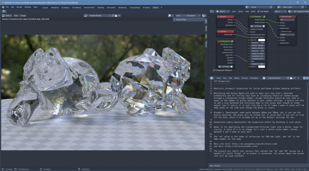 This is an easy to use realistic chromatic dispersion material for Blender that works in both Cycles and Eevee.
